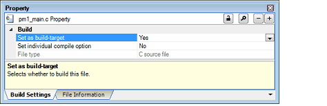 Select whether to set the compile option that differs from the project settings to the selected C source file. If [Yes(Level 3)(Perform with assuming it the whole program)(-Xwhole_program)] is selected in the [Perform inter-module optimization] property in the [Optimization(Details)] category from the [Compile Options] tab, this property will be grayed out and changed to [No]. This property is displayed only when a C source file is selected on the project tree and [Yes] in the [Set as build-target] property from this tab is selected. |