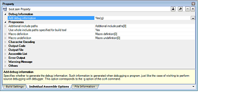 This tab shows the detailed information on an assemble source file categorized by the following and the configuration can be changed.