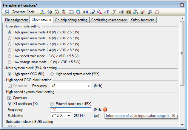When performing code generation, if you enter an invalid string in the Peripheral Functions panel, or a required input is missing, then a