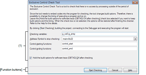 This dialog box is used to check whether exclusive control is correctly performed for a certain variable and make the settings required for checking. The checking result is displayed in the Functions and Variables Access Table panel.