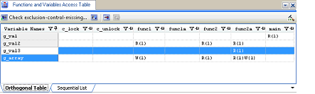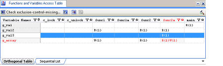After checking has completed, locations where exclusive control did not work have been detected are shown in error color on the Functions and Variables Access Table panel. The relevant location can be opened in an editor by double-clicking or pressing the [Enter] key at that location and the erroneous code can be found immediately.