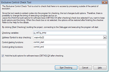 The exclusive control check tool checks whether there is any function that accesses variables outside the exclusive control period. In other words, it is a tool used to check whether any function is directly accessing variables without using the exclusive control mechanism.