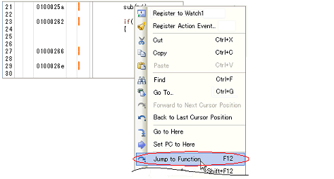 When a source file is opened, it automatically recognizes the currently selected characters or the word at the caret position as the function name and jumps to the first executable line of the target function.