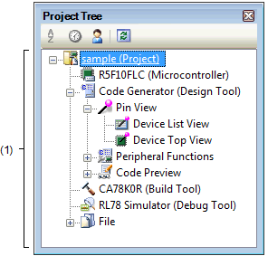 This area displays components of the project (microcontroller, design tool, build tool, etc.) in a tree structure.