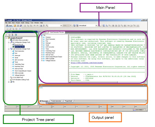 Main panel : Displays the panel (Device Top View panel, Code Generator panel, etc.) corresponding to the function selected in the Project Tree.