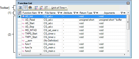 Note, however, that the function information in the files not to be analyzed is not displayed in this panel (see "1.1.1 What is analyzed").