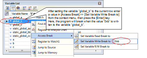 [Access Break] >> [Set Variable R/W Break to]: Sets a break event with read/write access condition. |
