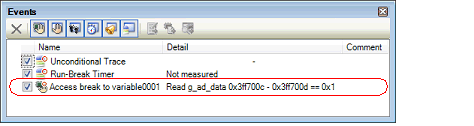 A break event set via this operation is managed in the Events panel as an event whose name is "Access break to variable".