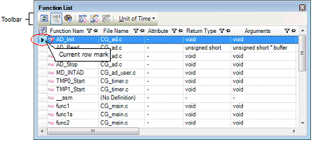 Note, however, that the function information in the files not to be analyzed is not displayed in this panel (see "1.1.1 What is analyzed").