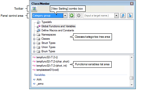 The acquired information is displayed in the classes/categories tree area (top) and the functions/variables list area (bottom). When a node on the tree displayed in the classes/categories tree area is selected, the information of the node (e.g. function names/variable names defined in the selected node) will be displayed in the functions/variables list area.