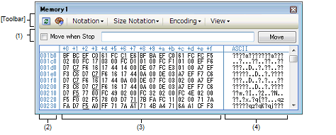 Specification of the display notation, display width of memory values or the number of view columns is performed by selecting the buttons on the toolbar or [Notation]/[Size Notation]/[View] from the context menu (see "2.9.1.2 Change display format of values").