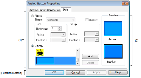 There are two types of analog button display styles, figure and bitmap. These styles can be changed on the [[Style] tab].