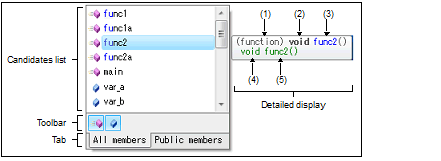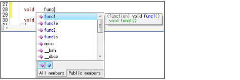 If the target is a class-type variable [CC-RX] that includes methods (functions) among its members, the types of the return values and names of the methods (functions) are displayed. Also, "(" ")" is appended to the end of each method name. |