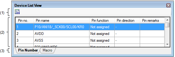 On the Project Tree panel, select [Project name (Project)] >> [Code Generator (Design Tool)] >> [Pin View] >> [Device List View], and then press the [Enter] key. |