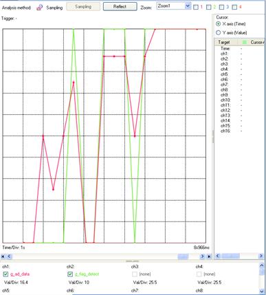 As shown below, CS+ makes it possible to get a visual grasp of changes in variables over time. This lets you analyze changes in values input from sensors, and whether parameters are correctly set, and control performed correctly, in response to those changes, which enables you to improve the quality of control.