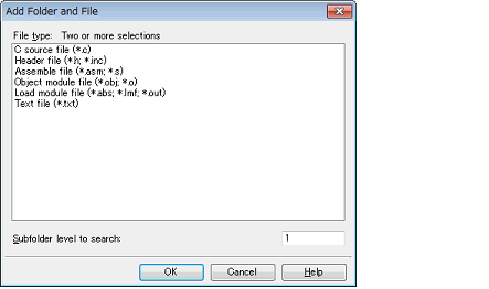 In the dialog box, select the types of the files to be added and specify the number of levels of the subfolder to be added to the debug-dedicated project. At this time, you can select multiple file types by left clicking while holding down the [Ctrl] or [Shift] key. If nothing is selected, it is assumed that all types are selected.