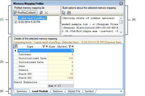The detailed memory mapping information that was acquired through analysis when profiling the items selected in the [Profiled memory mapping list] area are displayed in tabbed pages.