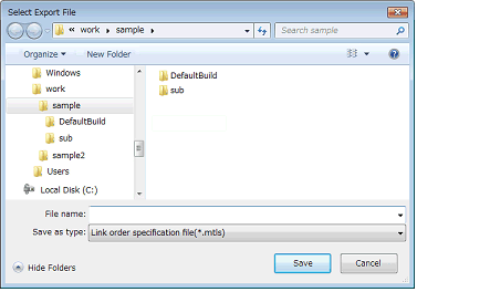 In the dialog box, specify the file (link order specification file) that is output the list of the file names displayed in [File] in the Link Order dialog box.