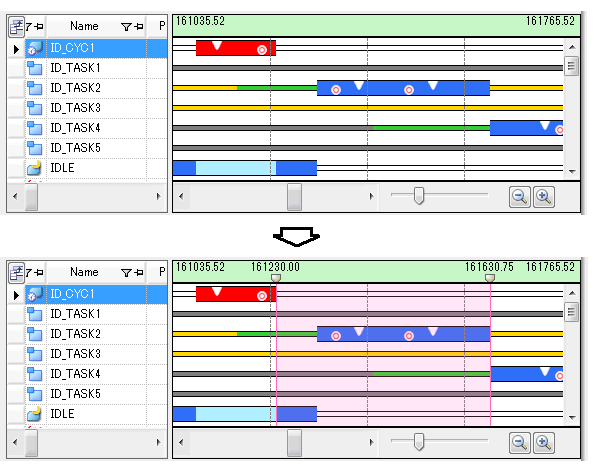On the Analysis Result panel, by dragging and dropping with the mouse cursor in the Execution transition display area in the Analysis information diagram area, the user can change the analysis information to be displayed in the Analysis information table area from "analysis information in the trace data acquisition period" to "analysis information in the analysis information extraction interval".
