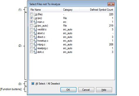 This dialog box is used to specify the files not to be analyzed by the analysis tool (see "1.1.1 What is analyzed").