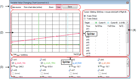 Up to a maximum of four of these panels can be opened. Each panel is identified by the names "Variable Value Changing Chart (zoomed in)1 - 4" on the title bar. From these panels, you can zoom in on the specified range individually.