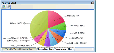 To do this, specify the number in the [The number of functions displaying in the Execution Time(Percentage) Chart] property in the [Analysis Chart] category on the [Settings] tab of the Property panel (set to [10] by default).