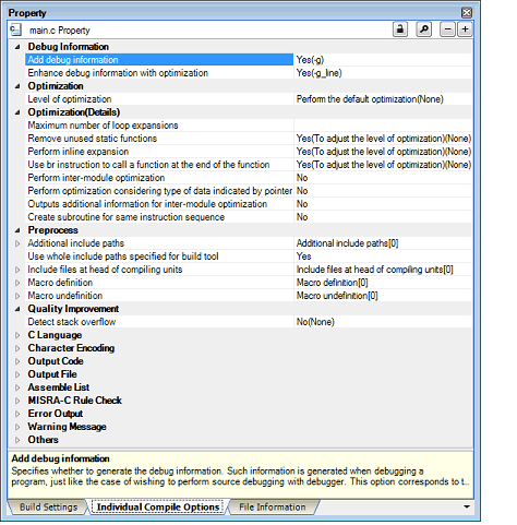 This tab is displayed only when [Yes] in the [Set individual compile option] property in the [Build] category from the [Build Settings] tab is selected. |