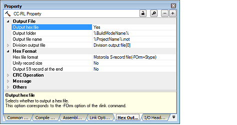 To set options for the hex output phase, select the Build tool node on the project tree and select the [Hex Output Options] tab on the Property panel.
