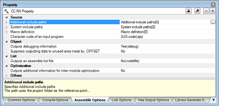 Specifies the output destination folder for the output file. The following placeholders are supported. %BuildModeName%: Replaces with the build mode name. %ProjectName%: Replaces with the project name. %MicomToolPath%: Replaces with the absolute path of the product install folder. If this is blank, it is assumed that the project folder has been specified. This corresponds to the -output option of the assembler. This property is displayed when [Always latest version which was installed] in the [Using compiler package version] property in the [Version Select] category from the [Common Options] tab is selected and the latest version is V2.00.00 or lower or when V2.00.00 or lower is selected in the [Using compiler package version] property. |