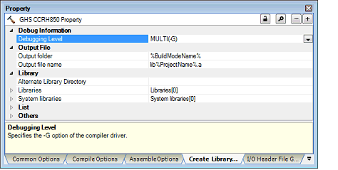 This tab is displayed only when the current project has been created with [Empty Application(GHS CCRH850)] or [Library(GHS CCRH850)] selected as the project type. |