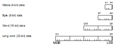 Data in memory have three sizes; byte (8-bit), word (16-bit), and longword (32-bit). The data arrangement is selectable as little endian or big endian. Figure 1.7 shows the arrangement of data in memory.