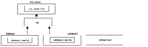The following shows the inheritance relation of the above classes. An arrow (->) indicates that a derived class references a base class. The streambuf class has no inheritance relation.