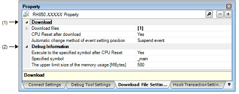 Specify with the Download Files dialog box. The Download Files dialog box is opened by clicking the [...] button that appears at right edge of this field when you select this property (you cannot specify the file to download on this panel). |