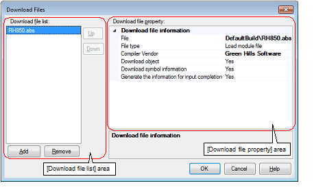 Select [Green Hills Software] in the [Compiler Vendor] property in the Download Files dialog box to add the load module file. |