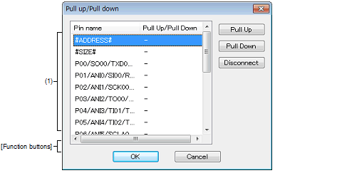 This dialog box is used to set or change the pin connection information of the pull-up/pull-down resistors, which are one of the connection parts of the I/O Panel window.