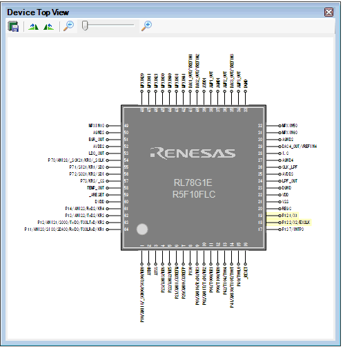 To open the Device Top View panel, double-click [Project name (Project)] >> [Code Generator (Design Tool)] >> [Pin View] >> [Device Top View] in the Project Tree panel.