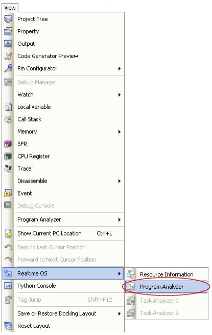 From [View] menu, select [Realtime OS] >> [Program Analyzer], program analyzer is started.