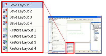 You can save up to four panel layout states for before and after connecting to the debugging tool. To do so, from the menu bar, select [View] > [Save or Restore Docking Layout].