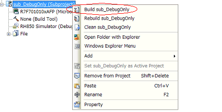 Select the debug-dedicated project, and then select [Build active project] from the context menu.