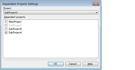 Dependent projects are set in the Dependent Projects Settings dialog box which is opened by selecting the [Project] menu >> [Dependent Projects Settings...].