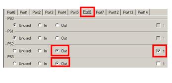 In this step, you decide which pins to use. Refer to the circuit diagram shown below. Bit 2 and bit 3 of the port 6 are used as outputs. In QB-R5F100LE-TB, these are connected to LED1 and LED2 respectively.