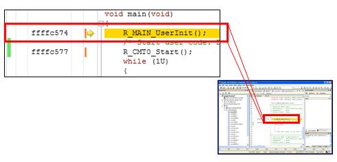 A program counter (PC) is a control register that holds information on the next program address. When the RX100 Series generates a reset signal, PC is set to the reset vector address FFFFFFFCH and FFFFFFFFH.In the program of this tutorial, address FFFFC000H is set after resetting. In the default setting of CS+, C source code is displayed after running the program from the reset address to the beginning of the main function when the Reset button is pressed in order to enhance the efficiency of program development using the C source code. You can change this behavior by [Download File Setting] tab in the Debug Tool Property.