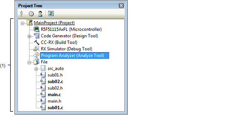 This panel is used to display components of the project (microcontroller, design tool, build tool, debug tool, etc.) in a tree structure.