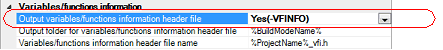 Set the [Output variables/functions information header file] property to [Yes] to generate an empty variables/functions information header file, and add it to the project (it will also appear in the File node of the project tree). The output destination is the file set in the [Output folder for variables/functions information header file] property and the [Variables/functions information header file name] property.