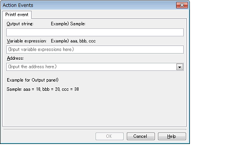 By executing the program, the program momentarily stops immediately before executing the instruction at the location where this event is set, and the value of the variable expression specified in this dialog box is output to the Output panel.