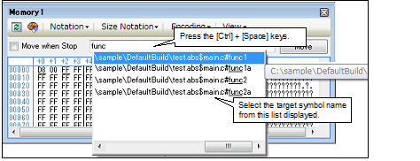 The list of symbol names appears by pressing the [Ctrl] + [Space] keys when a part of the target symbol name is being input in the text box that supports this function. In this list, double-click the target symbol name (or press the [Space]/[Enter] key after selecting it by using the [Up]/[Down] key) to complement the symbol name currently being input.