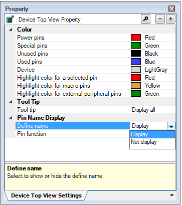 Note that additional information is selected from the Property panel, on the [Device Top View Settings] tab, by selecting the corresponding information under [Pin Name Display].