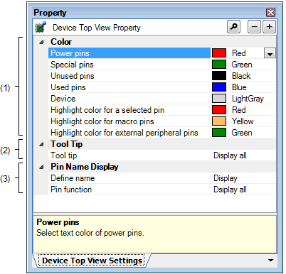 On the Project Tree panel, select [Project name (Project)] >> [Pin Configurator (Design Tool)] >> [Device Top View], and then select [Property] from the [View] menu. |