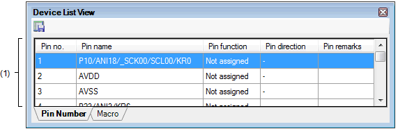 On the Project Tree panel, select [Project name (Project)] >> [Code Generator (Design Tool)] >> [Pin View] >> [Device List View], and then press the [Enter] key.