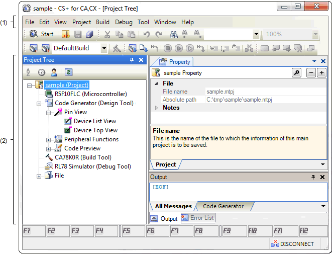 This is the first window to open when CS+ is launched. This window is used to operate various components (design tool, build tool, etc.) provided by CS+.